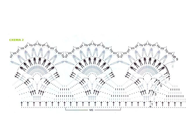Avant partie: soulève les boucles de la chaîne principale et forme 10 droites R., chacune 3 R. 9 fois 1 P., chaque 2 R. 7 fois 1 P., puis 18 * 1 P. Le bord est également décoré selon le deuxième motif. Reliez les bonnets du futur soutien-gorge à l'aide d'un anneau (cravate à S.B.N.), ajoutez des lanières.