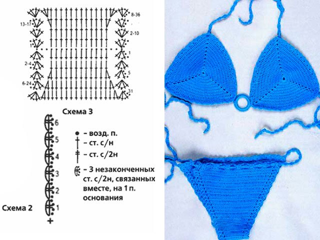 Ensuite nous faisons bikinis populaires: partie avant 18 V.P. + 3 V.P. monter, sur With / X 3 direct et rendre R. sur 31 R. Retour le côté du produit commence par attacher le fil au dos de la chaîne. Continuer en C / X 3 de la même manière: R. direct et inversé à 36 R. Assemblage du maillot de bain: attachez-le autour du périmètre du produit.