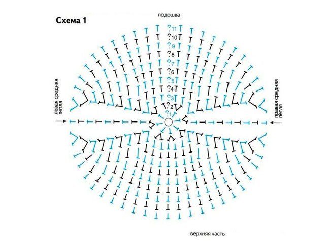 Fil: Souffle, fil Semenovskaya, acrylique 100%, 292 m / 100 g. Consommation de fil 25 g. Outils: Numéro de crochet 2.5. Taille: longueur de la semelle 12 cm. Les chaussons de pantoufles sont crochetés en colonnes. La semelle est ovale. Voir un atelier détaillé sur les semelles de tricot et vous pouvez tricoter une semelle de la taille dont vous avez besoin de votre fil. Semelle extérieure longueur 12 cm, largeur 6 cm Au début, nous avons tricoté une chaîne de boucles à air de 7 cm de long ou 13 boucles, plus une boucle de soulèvement à l'air. Après avoir connecté la semelle selon le schéma, nous obtenons 56 boucles le long du périmètre de la semelle.