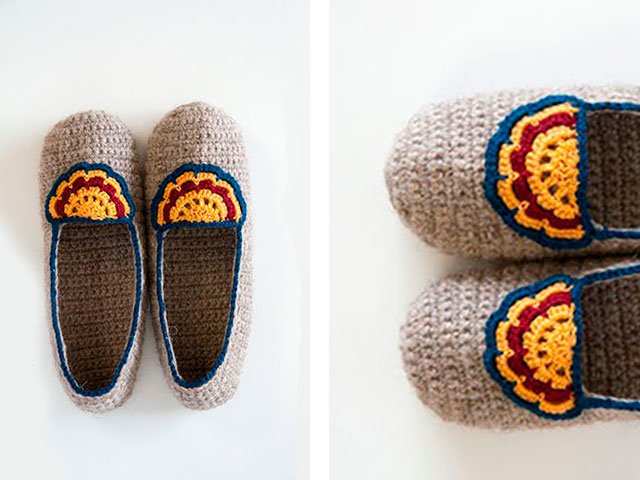 Nous continuons à bien tricoter le talon de la même manière, en attachant des boucles à partir des parties latérales. Terminez de tricoter le talon avec la rangée avant. Le résultat est un talon soigné. Maintenant, nous attachons le bord du chausson (à l’exception du talon) avec des colonnes à crochet simple, en tirant légèrement le bord pour un meilleur ajustement du pied. Ensuite, nous tricotons une rangée de poteaux de jonction le long du bord, y compris le talon. Coupez le fil et cachez son extrémité. Slipper est prêt. Nous avons tricoté le deuxième de la même manière.