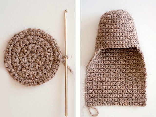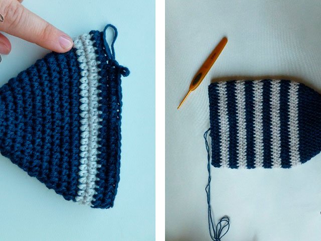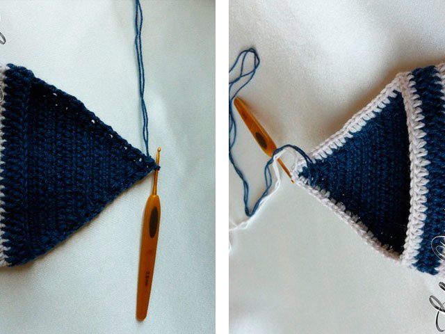 Tricoter un triangle sur 27 boucles, en diminuant une boucle de chaque côté des deux côtés (tricoter 2 demi-poteaux ensemble) jusqu'à ce qu'il reste 1 boucle au crochet.