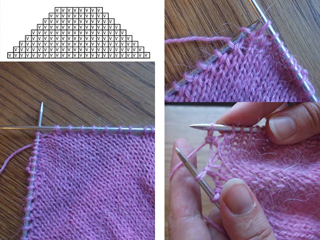Encore une fois nous retournons le travail et tricotons 11 + 11 boucles, etc. Autrement dit, dans chaque rangée, nous tricotons 1 boucle de moins (nous réduisons les rangs) jusqu'à ce qu'il ne reste plus que 8 boucles au travail. Nous allons maintenant commencer à augmenter le nombre de boucles de travail en tricotant à chaque rang une boucle précédemment supprimée. Pour faire en sorte que le tricot ne présente pas de trous, nous procédons de la manière suivante: nous plaçons une boucle latérale sur l'aiguille à tricoter gauche, et nous tricotons ensemble cette boucle usée et la suivante. I.e. le nombre de boucles de travail augmentera de 1.
