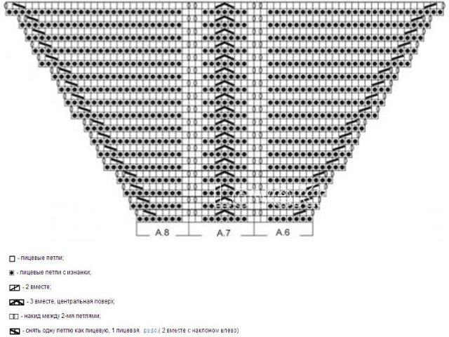 Nous prenons 18 pts avec un double fil. Nous faisons le 1er ir. adresse IP pertinente Après chrome. on tricote un point de chaque fil transversal, on obtient un total de 35 points, puis on tricote le motif principal avec un seul fil conformément au schéma et à la description. Nous faisons selon le schéma, * 7 fois le rapport (répétition) et finissons selon la figure. Après 23 p. nous aurions dû obtenir 99 P. Après le 143ème p. sur les aiguilles, nous avons 419 m. fermer toutes les boucles À la fin, nous tendons le châle et le repassons sous une serviette humide.