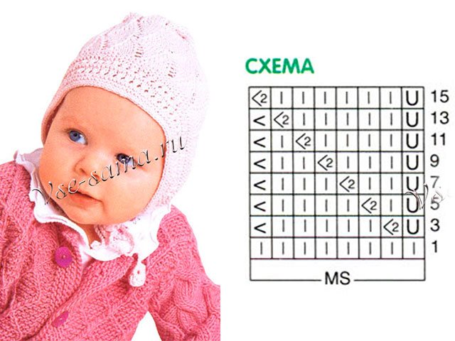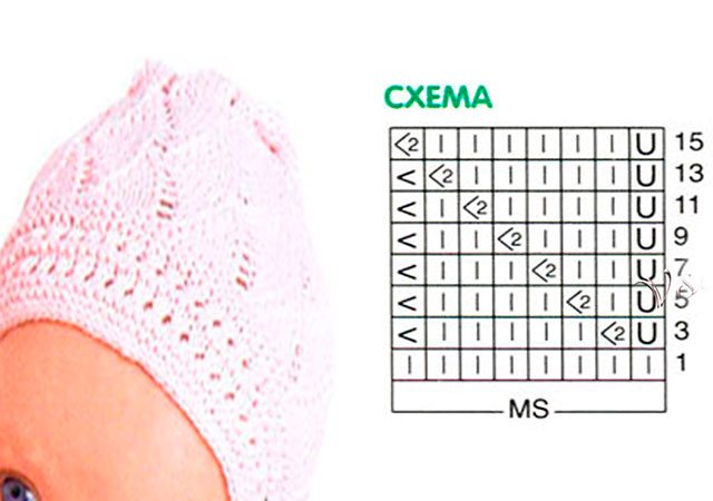 Comment commencer à tricoter un beau chapeau ajouré avec des motifs? Pour commencer, décidez couleur et le matériau du futur couvre-chef, ramasser densité l'accouplement. Ce produit est conçu pour un enfant. 2 à 6 mois. Choisissez un fil de 50 gr de la couleur désirée et nous prendrons des aiguilles roses (Baby Cotton), droites et à chaussettes. Choisissez des fils de la même épaisseur requise. Passons maintenant aux patrons - ils ne sont que 7, certains tricotés en rangs circulaires.