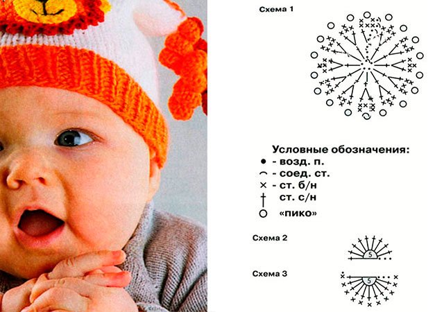Bien sûr, vous ne pouvez pas décorer un chapeau pour un nouveau-né applique de lionceaumais nous vous dirons quand même comment le faire. S / X 1 tricoter une petite tête orange fil dont le dernier R. est marron. Jaune colorer l'oreille droite et gauche (C / X 2). La tête presque prêt - il reste à attacher le museau. Il est facile de tricoter selon le schéma 3. Toutes les pièces sont connectées en un seul dessin, vous pouvez ajuster la taille vous-même. Pour les bébés - La meilleure option avec un élastique et un personnage amusant. Votre enfant va définitivement tomber en amour avec un tel chapeau! Vous pouvez également crocheter un chapeau pour un nouveau-né, mais avec des aiguilles à tricoter, il sera plus dense et chaud.