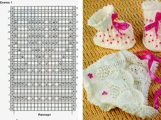 Bottillons tricotés pour les nouveau-nés avec des aiguilles à tricoter avec une description, commençons par tricoter des chapeaux. Motif ajouré numéro 1 Tricot 87 P.L. - 2,5 centimètres. Nous effectuons la fermeture: dans chaque 2 R. - 1 * 9 P., 1 * 10 P., 1 * 14 P. Toutes les autres boucles - se ferment dans un R. Ceci est le devant de la casquette. L'arrière est complètement en C / X 2.