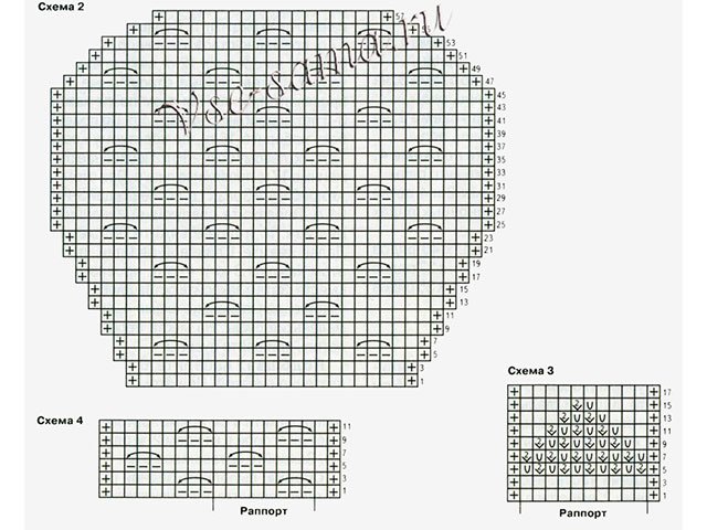 - Motif ajouré numéro 1. 1 R.: L. P.., 2 et 4 R.: tous les P. et le fil - I.P., 3 R .: 1 fil 2 P. avec L.P., répéter à la fin de R.