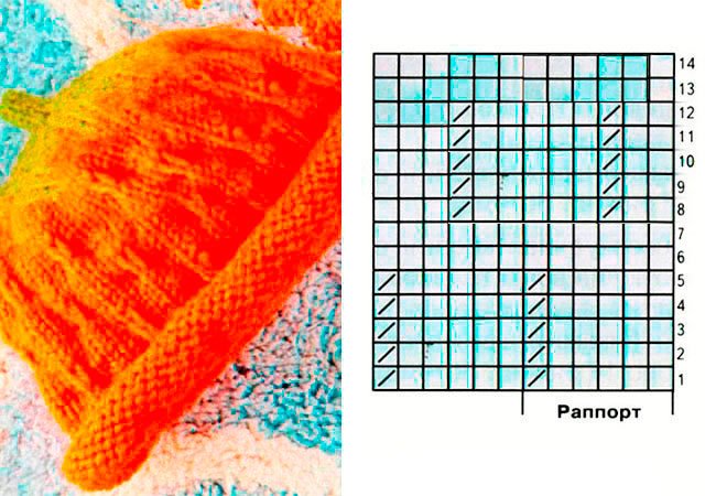 Pour commencer, composez 72 P. en orange, effectuez L.G. trois rondelles R. 28 suivant les tricot R.BLACKBERRY"Selon le schéma. Après cela - à nouveau L.G., où 1 R: 5 P. orange, 1 P. - vert. Et ainsi, jusqu’à la fin de R., essayez de trouver les boucles vertes et placez-les entre le tir P. du motif "BLACKBERRY". Dans R. ci-dessous - répétez le motif de couleur. Les deux suivants R.: 4 P. oranzh., 2 P. vert.