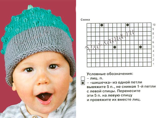 Couleur grise - 72 P. - 20 R. L. G. (tous I. et L.R. - L.P.). les 20 prochains R. - un motif avec "bosses" vert une touche. 3 R.L.G. le fil le plus léger. Dans chaque 2 R. retirez également 8 P. Dans les 2 R. suivants - 2 P.Tricoter le tissu encore 2 cm, après quoi le fil peut être coupé. Les chapeaux tricotés et les choses avec des aiguilles à tricoter sont bons, mais nous ne pouvons pas toujours trouver la taille exacte du produit. Dans ce cas - il est préférable de crocheter - vous pouvez y essayer des vêtements pendant le travail. Nous n'offrirons pas une telle option dans cet article, mais l'alternative devrait toujours être considérée!