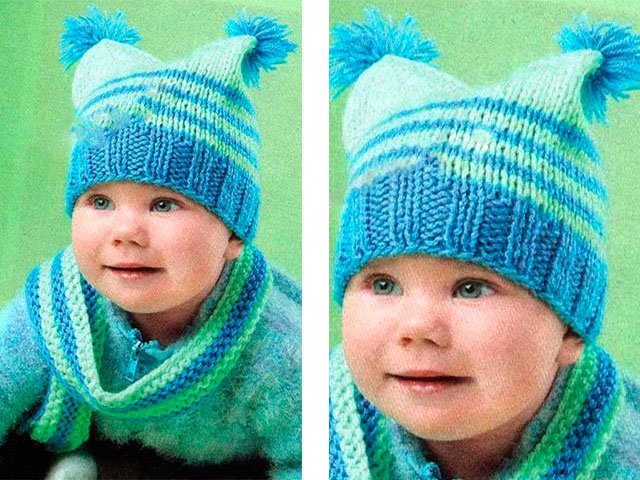 Et nous vous donnerons un autre modèle - Bonnet bébé tricoté pour bébé avec oreilles rigolotes - pompons. Fils de deux couleurs: bleu et menthe.