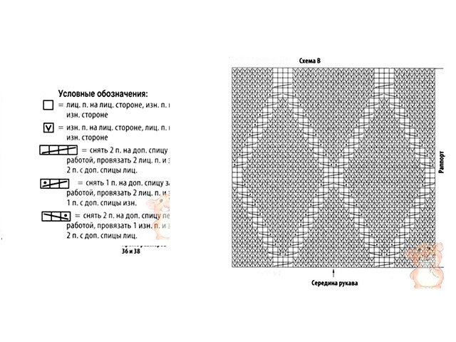 Avec les aiguilles à tricoter N ° 6, composer le numéro 42 p., Tricoter 5 cm en lignes droites et inversées avec un élastique 1 x 1, comme pour le dos. Dans le dernier out. row réduit uniformément le nombre de boucles à 42. Ensuite, remplacez les aiguilles à tricoter par le numéro 7 et tricotez avec un motif en relief selon le schéma B, en calculant le début du motif (le milieu du motif est indiqué par une flèche).
