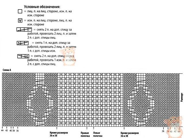 Taper 74 m avec les aiguilles à tricoter numéro 6 et tricoter 5 cm x 2 élastiques (2 faces, 2 dehors), en partant de l'extérieur. rangée, comme suit: chrome. n., 1 sur. n., 2 personnes. n., * 2 out. n., 2 personnes. n. *, répétez à la fin tricot 1. n., chrome. p. Dans le dernier out. de suite, réduisez le nombre de boucles à 69. répartissez les aiguilles à tricoter sur le numéro 7 et tricotez avec un motif en relief conformément au schéma A. À une hauteur de 19 cm, réduisez pour les points de couture n ° 1 point de chaque côté. Répétez la diminution tous les 7 cm pour un total de 3 fois = 63 p.