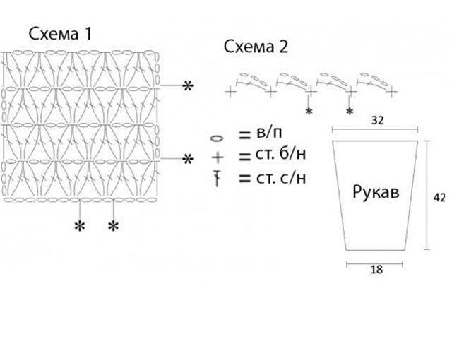 Manche: Composez 66 boucles d’air dans une chaîne + 3 boucles de levage. Tricotez avec un motif fantaisie selon le schéma 1. En même temps, ajoutez 1 boucle de chaque côté de chaque rangée - 26 fois. À une hauteur de 42 cm, terminez le travail.