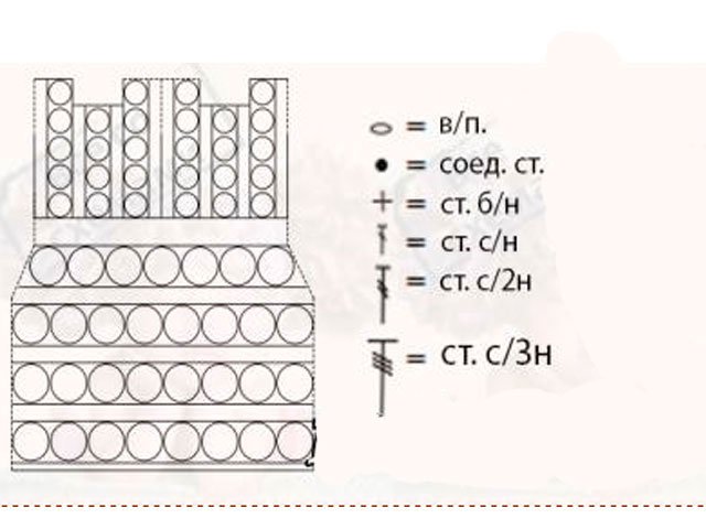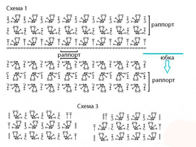 Volants:connectez le fil à la chaîne de départ. Tricoter de l’autre côté de la chaîne, 1 à 9 rangées du schéma 2. Terminer ensuite 10 à 16 rangées pour le volant inférieur. Connectez le fil dans la 5ème rangée d'arches, répétez 10 à 16 rangées du schéma 2 pour le volant central. Connectez le fil dans la 1ère rangée, répétez 10 à 16 rangées pour le volant supérieur.