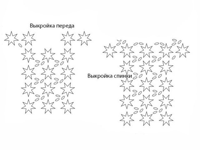 Rayures verticales de motifs: tricotez de petits motifs en les reliant en lanières. Tricoter 2 bandes de 4 motifs et 2 bandes de 10 motifs. Reliez les bandes du motif et les bandes de motifs en une toile solide selon le motif, utilisez le schéma 2 (colonnes au crochet tricotées dans une bande de motifs fantaisie, colonnes au crochet dans les motifs), laissez 17 cm le long de la ligne pointillée et du dos pour les emmanchures.