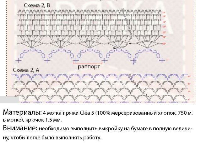 Avant et arrière:fil blanc Cléa 5 et crochet 1,5 mm. composez une chaîne de boucles d’air de 80 cm de long, reliées à l’anneau par une colonne de liaison. Tricotez avec un motif suivant le schéma 1. À une hauteur de 60 cm, divisez l'ouvrage en deux et terminez le dos et séparément avant les rangées.