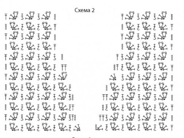 Avant et arrière: composer 138 v / p dans la chaîne.Tricoter en rangées d'avant en arrière. Tricoter avec des tables au crochet dans chaque boucle - 1 rangée. Tricotez ensuite selon le schéma 1, en répétant le rapport entre * - * - 16 fois. Après 14 cm, répartissez l'ouvrage à l'envers à l'avant et aux emmanchures comme suit: Tricotez 2 rapports entre * - *, 28 pb, sautez 4 rapports entre * - *, faites une trace. 4 rapports entre * - *, 28 pb, sauter 4 rapports entre * - *, tricoter 2 rapports entre * - * = couper au dos. Continuer à tricoter selon le motif 1. À 36 cm de hauteur, mettre de côté.