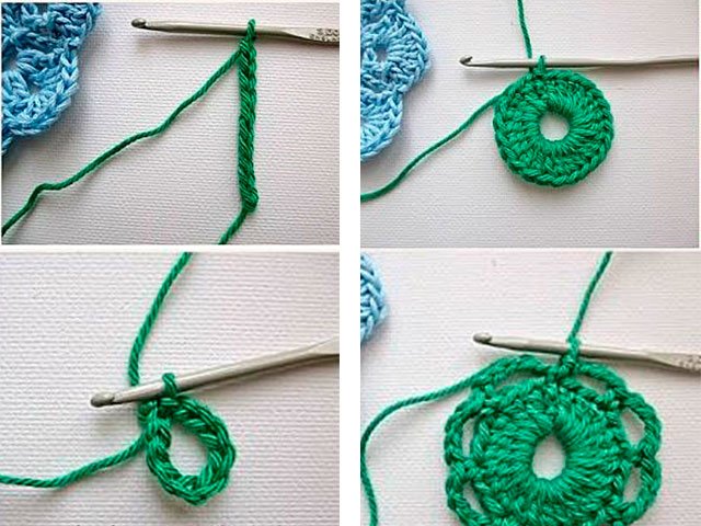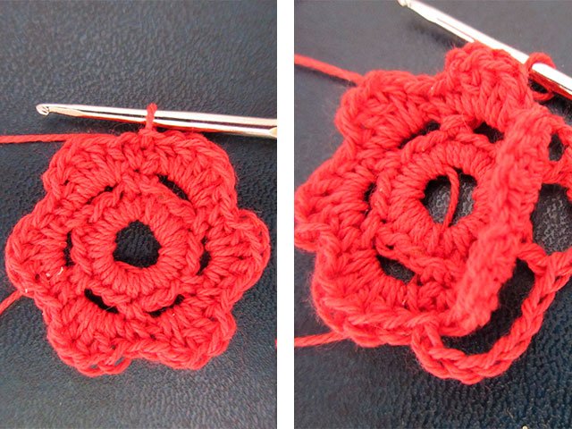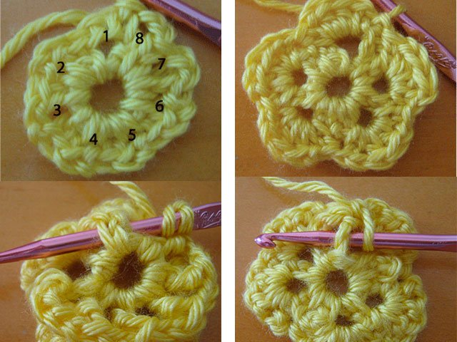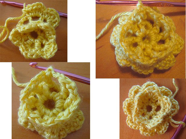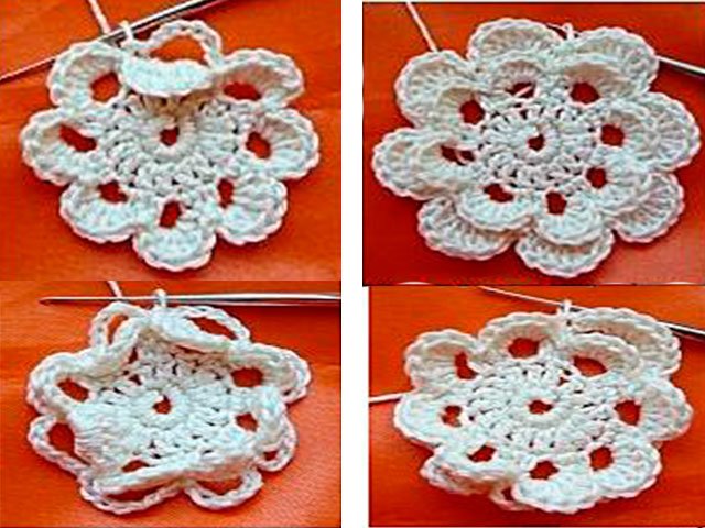 - 3 R: dans chaque arcade. Que nous avons sellé ci-dessus - 5 V.P., 1 P.ST., 5 V.P. Entre chaque pétale obtenue, n'oubliez pas de tricoter S.S.
