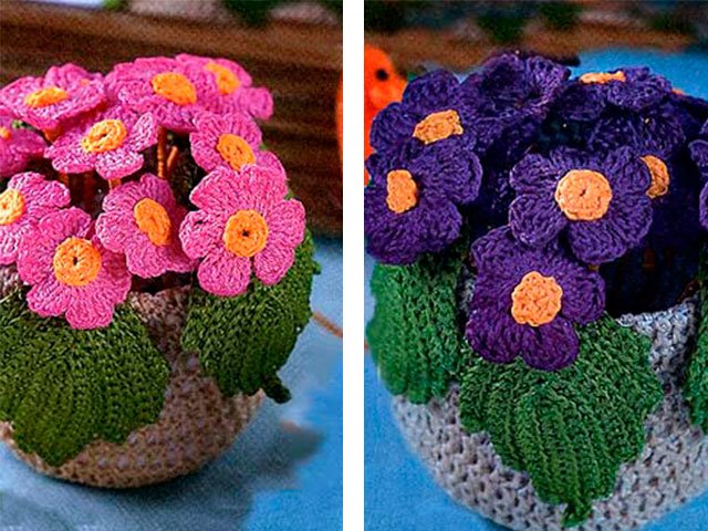 Nous collectons proprementtous les détails les féculents, nous mettons un vase sur une forme, de préférence une paume. Ces fleurs en pots au crochet seront très belles sur le bureau de l'ordinateur.