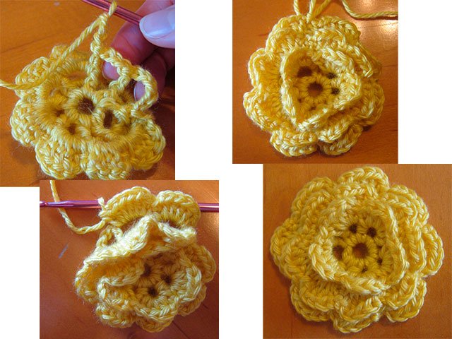Faisons une autre fleur volumineuse. Il sera différent du précédent en ce qu'il sera en couches. Pour lui, nous avons pris un fil plus fin et un crochet plus petit.