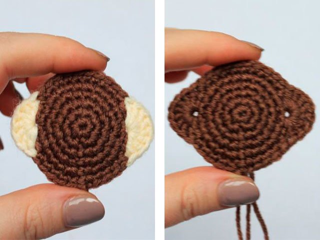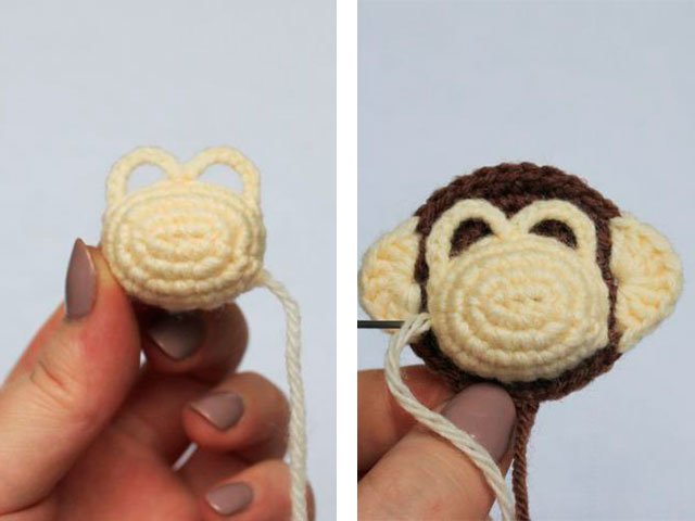 - 5 S.B.N. Ensuite, changez le fil pour le rendre plus léger pour faire les oreilles: 8 S.S.N. dans la 3ème boucle de la boucle de travail. Nous tricotons avec un fil noir 10 S.B.N. (également 3 boucles du crochet), filetage léger 8 S.S.N. (en 3 boucles), couleur foncée - 5 S.B.N. (en 3 boucles)