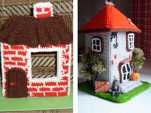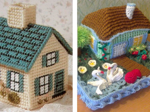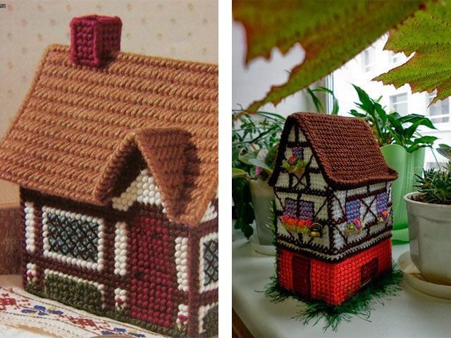Le plus souvent, on offre aux débutants d'attacher un jouet - maison, puisque cela vous convient le mieux et que vous devez remplir votre main avant d’effectuer un travail complexe! Besoin attacher 6 bords latéraux de la maison (6 carrés de la même taille que vous aimez), faire un toit et coudre toutes ces pièces en 1. Remplissez avec un rembourrage en polyester ou un enduit, puis décorez les murs: faites une porte où des chiens de garde, des fleurs aux fenêtres, des rideaux, etc. peuvent s'asseoir. La maison tricotée est prête! Voici une telle classe de maître!