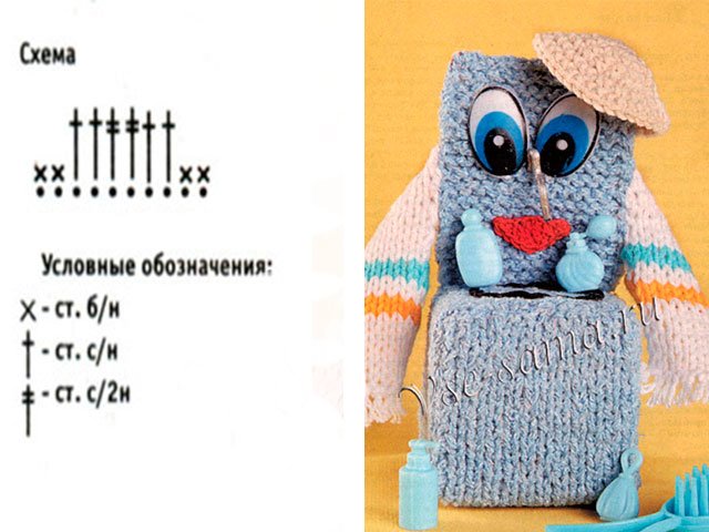 Nous allons connecter un merveilleux Moidodyra aiguilles à tricoter pour votre enfant! Vous aurez besoin d'un fil acrylique en couleurs: blanc, bleu, jaune, crochet, aiguilles à tricoter, feutre pour les yeux ou déjà prêt à l'emploi, boîte sous forme de cube et de fil.