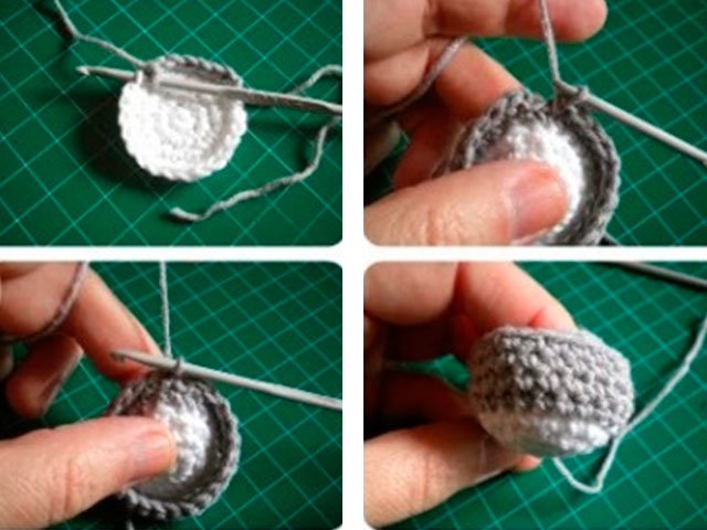 Deux oreilles grisé: 3 S.B.N. dans l'anneau d'amigurumi, 2 S.B.N. dans chaque S. B.N.