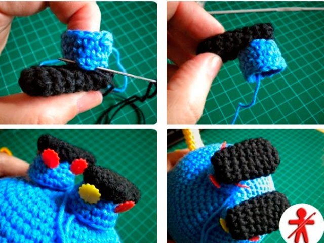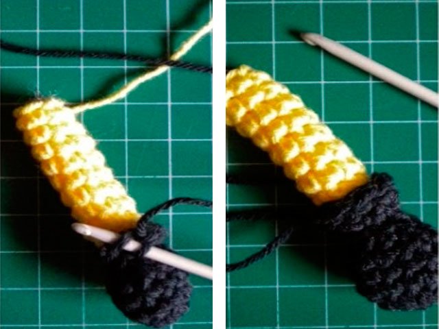 Poignets et bras. La main se compose de fil noir et jaune. Commençons par le premier. 6 V.P. dans le ring, P.R. 6 fois (rangées 3 à 5) 12 S / B, 5 U.B. Après cela, nous attachons le fil jaune: 7 S.B.N. sur le mur du fond, (de 8 à 16 R.). 7 S. B.N., dans la dernière rangée 2 U. B.
