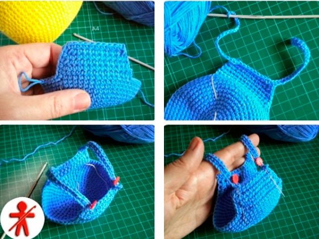 Nous allons faire les fils de couleur noire des chaussures: 6 V.P. dans le ring. P.R. 6 fois, 12 S.B.N. (toutes les 3 et 4 rangées), 4 S.B.N. + WB 2 fois. Du sixième au neuvième rangs de 10 S. B.N. Ensuite, cousez la jambe en bleu directement sur la chaussure. Nous collectons dessus 12 S. B.N., 3 S. B.N., P.R. 3 fois et 15 S.B.N. dans la dernière cinquième ligne.