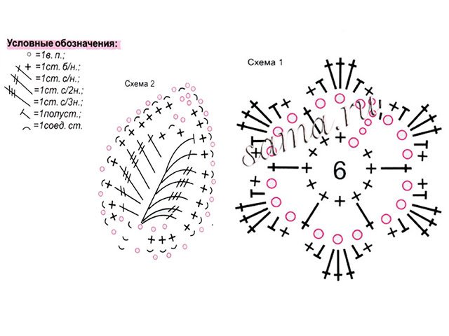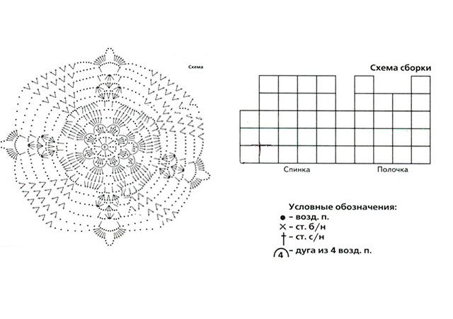 Couleur primaire: chaîne 120 V.P. tricoter un empiècement en C / X dans le cercle 1. Après 9 R. changer la couleur en crème (3 R.), à nouveau en corail pour obtenir 18 R. Pour l'emmanchure, composer 10 V.P., pour les manches laisser des boucles des deux côtés. Plus loin dans un cercle (diagramme 2). Après 20 R. sont prêts - commencez l'alternance de couleurs, basée sur le schéma. Les bords du produit cravate S.S.N. Fleur à effectuer C / X trois.