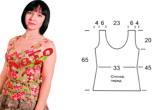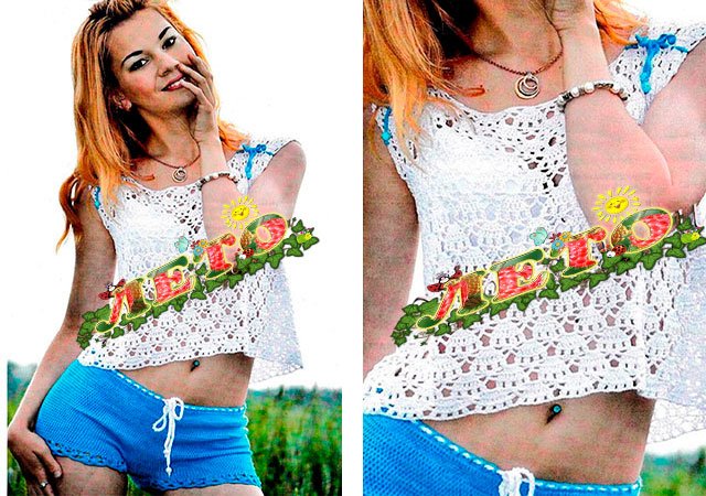 Ce crop top est très beau avec un short tricoté. Nous allons le tricoter en deux parties: avant et arrière. Pour avant composer le 120 V.P. dans la chaîne. Tricoter sur C / X les 30 derniers centimètres. Faire cou - les deux épaules devront être tricotées à tour de rôle, en laissant 22 cm pour la coupe au centre de la toile. La taille de l'épaule est de 10 x 10 cm.