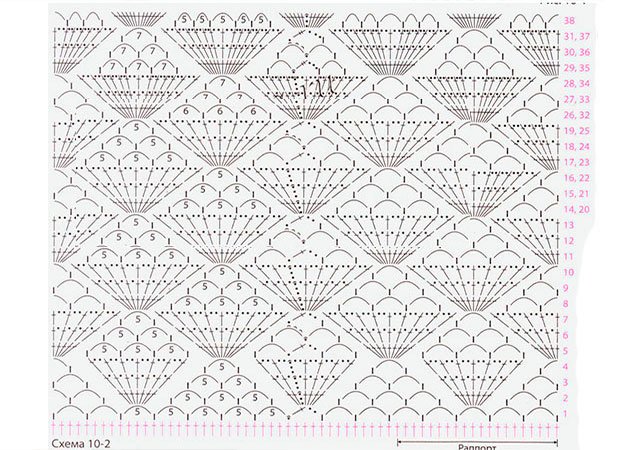 Donc notre futur t-shirt à bretelles Tricots dans une toile continue. Commence avec top futurs T-shirts: 200 V.P. dans le ring, 3 V.P. pour soulever. Suivant circulaire R. de S.S.N. Ainsi, commencez chaque nouveau R. - avec 3 V.P., et terminez-le avec l'aide de S.S. Lorsque vous faites 8 centimètres S.S.N. - Tricoter sur C / X 10 - 1 (exactement quarante rapports). Maintenant la partie inférieure selon le schéma 10-2. La toile en largeur doit pouvoir recevoir 10 rapports du motif. L'ordre suivant vous aidera à rester sur la bonne voie: répétez 1 fois 14 à 19 R., puis 1 fois 26 à 31 R.