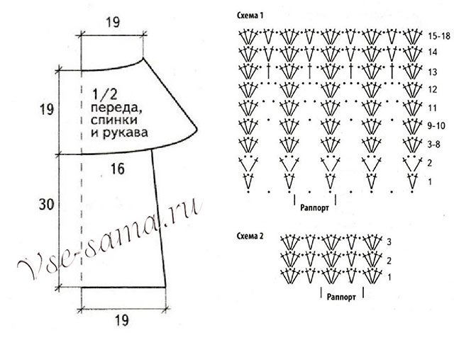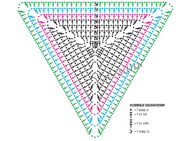 Tricot tous les éléments selon le schéma. Pour le produit dont vous aurez besoin 27 triangles pour devant pièces et la même chose pour retour. Total: 54 triangles. Vous pouvez les connecter de différentes couleurs, vous pouvez en choisir un ou deux. Ensuite, ils doivent être cousus les uns aux autres. Mais il est préférable de laisser le fil à la fin (1 m) après avoir cousu tous les éléments ensemble et d'attacher toutes les pièces avec lui. Décolleté, manches et en bas attacher S.B.N. + 1 V.P.