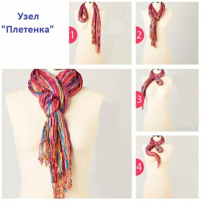 Un tel nœud semble visuellement difficile, mais il est trompeur. Pour attacher un long foulard de cette manière, il ne vous faut qu'une demi-minute. Il est préférable d’utiliser un accessoire en mousseline avec une petite frange.