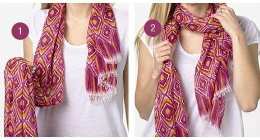 Étape 1 et 2. Pliez plusieurs fois un foulard en soie en deux fois et jetez-le sur le cou. À une extrémité, nous faisons un noeud faible. Passez l'extrémité libre du tissu à travers le nœud obtenu.