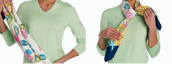 Étape 1 Un petit foulard en soie est plié en une longue bande étroite et se porte autour du cou.