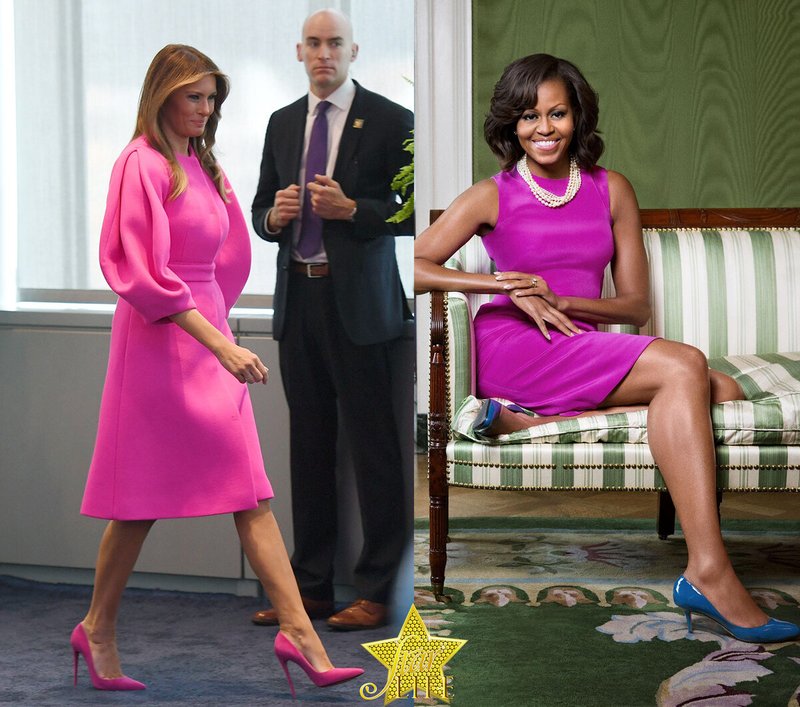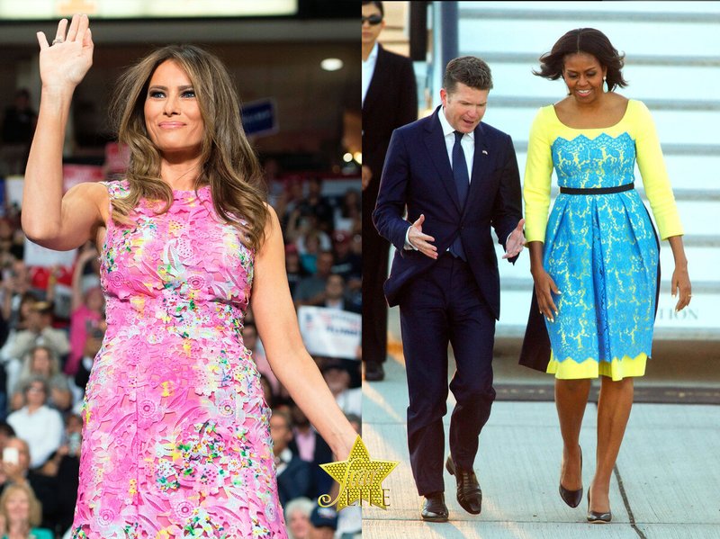 Melania est une amoureuse ardente du rose et, dans ce cas, elle ne s'est pas encore trahie. Cependant, pourquoi la robe jaune acide avec une applique bleu néon sur Michelle n'est pas claire.